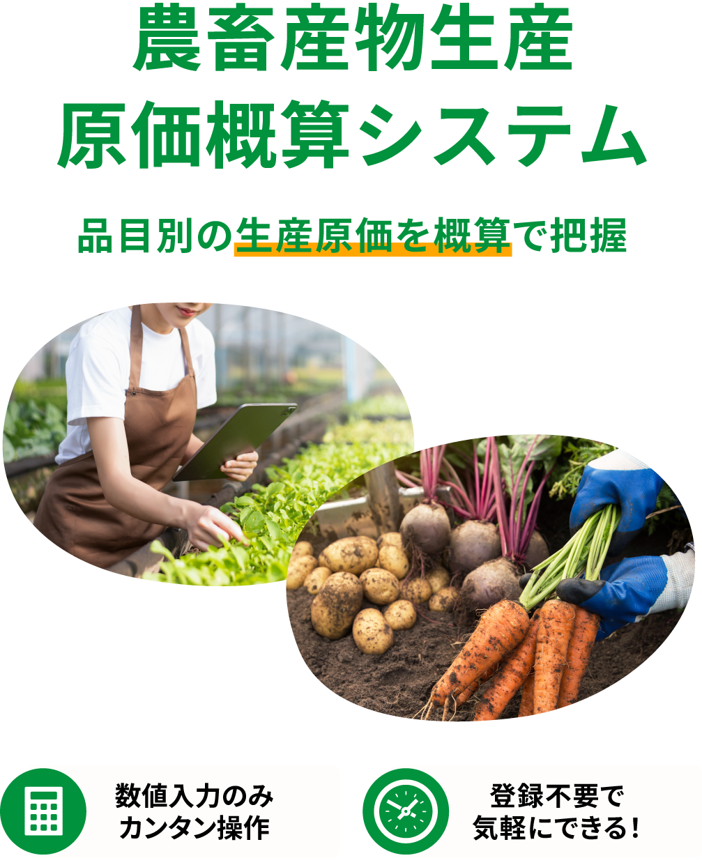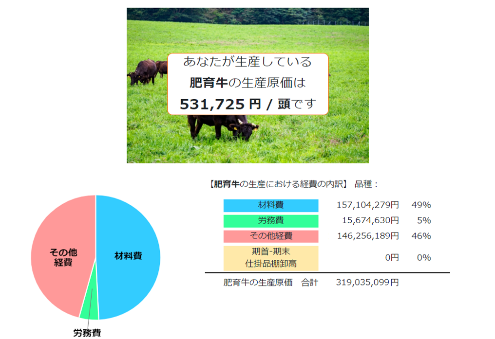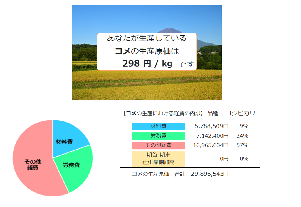 決算書(生産原価報告書や青色申告書など)に記載された金額と、品目ごとの割合等を入力することで、品目別に材料費、労務費、その他経費等の内訳と生産原価の概算値とが把握できます。